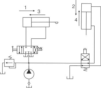動(dòng)作開(kāi)始時(shí),扳動(dòng)換向閥,使其右位接入系統(tǒng),水平液壓缸活塞向右移動(dòng)(動(dòng)作1),到達(dá)終點(diǎn)時(shí)撞塊交二位四通行程壓下,垂直液壓缸活塞向下運(yùn)動(dòng)(動(dòng)作2),當(dāng)和動(dòng)換向閥換向以后,水平液壓缸向左退回(動(dòng)作3),當(dāng)撞塊離開(kāi)行程閥時(shí),行程閥復(fù)位(圖示位置)垂直液壓缸活塞上升(動(dòng)作4),實(shí)現(xiàn)了按1-2-3-4的順序動(dòng)作。調(diào)節(jié)撞塊的位置,就可以控制動(dòng)作2繼動(dòng)作1之后開(kāi)始的時(shí)間。