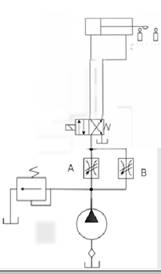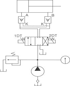 雙作用缸,液控單向閥,二位四通單電磁換向閥,三位四通雙電磁換向閥,電器行程開(kāi)關(guān),溢流閥