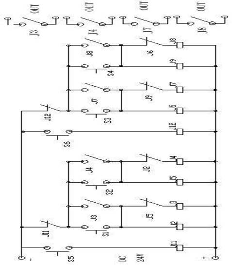 說(shuō)明:圖為互鎖的接線方法,其中S1是換向1 、S2換向2、 S5 停止、S4換向1 、S3換向2 、S6停止,如果用行程開(kāi)關(guān),直接并在按鍵兩頭即插孔可以直接并在開(kāi)關(guān)上即可。J3、J4、J7、J8繼電器為控制繼電器其端子控制輸出J2、J5、J6、J9、J11、J12為輔助繼電器。圖中的OUT為控制端。