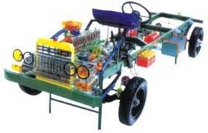 選用透明有機(jī)玻璃制作,內(nèi)部件均以硬質(zhì)塑料一次成型,用 螺絲固定在金屬高溫烘漆而成的車架上。各總成部分都以壓模成形加工,代替過去膠粘合的方法,使產(chǎn)品在強(qiáng)度上有很大提高。發(fā)動機(jī)總成用電機(jī)驅(qū)動,在油門處設(shè)有調(diào)速裝置,能演示發(fā)動機(jī)轉(zhuǎn)速高低。離合器分離明顯,操縱靈活,離合器外殼整體壓模而成,變速箱和各檔齒輪用各種顏色表示,換檔靈活,手制動美觀。后橋外形壓模而成,內(nèi)中主減速、差速轉(zhuǎn)動自如,輪轂剎蹄壓模成型,剎蹄可調(diào)節(jié),前橋輪鼓可調(diào)整,轉(zhuǎn)向裝置以及電瓶、油箱、水箱,制動管路分布清楚一目了然。電路采用對插件前后分布,燈架、風(fēng)窗、儀表板、后燈架用透明有機(jī)玻璃壓模成整體美觀逼真。